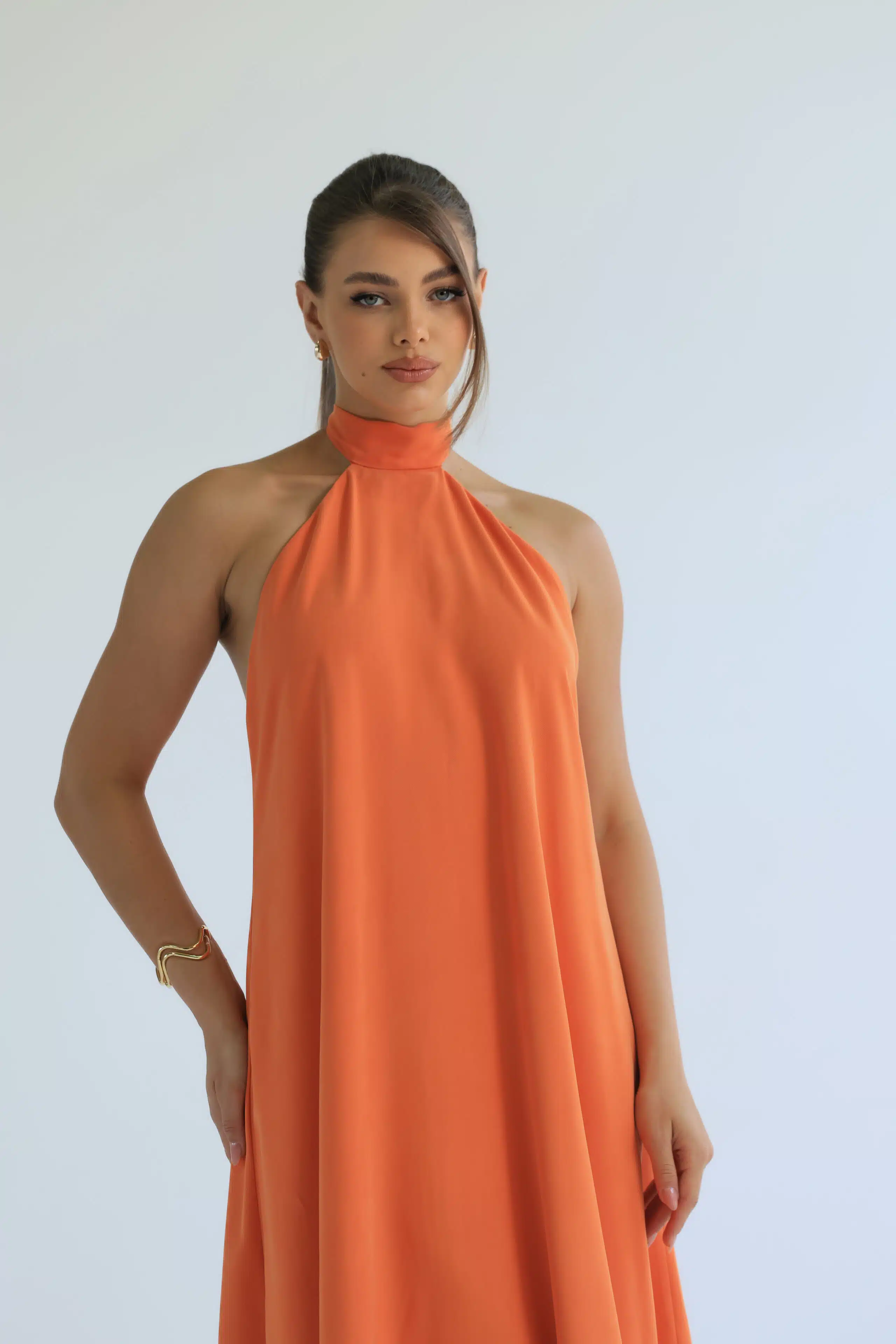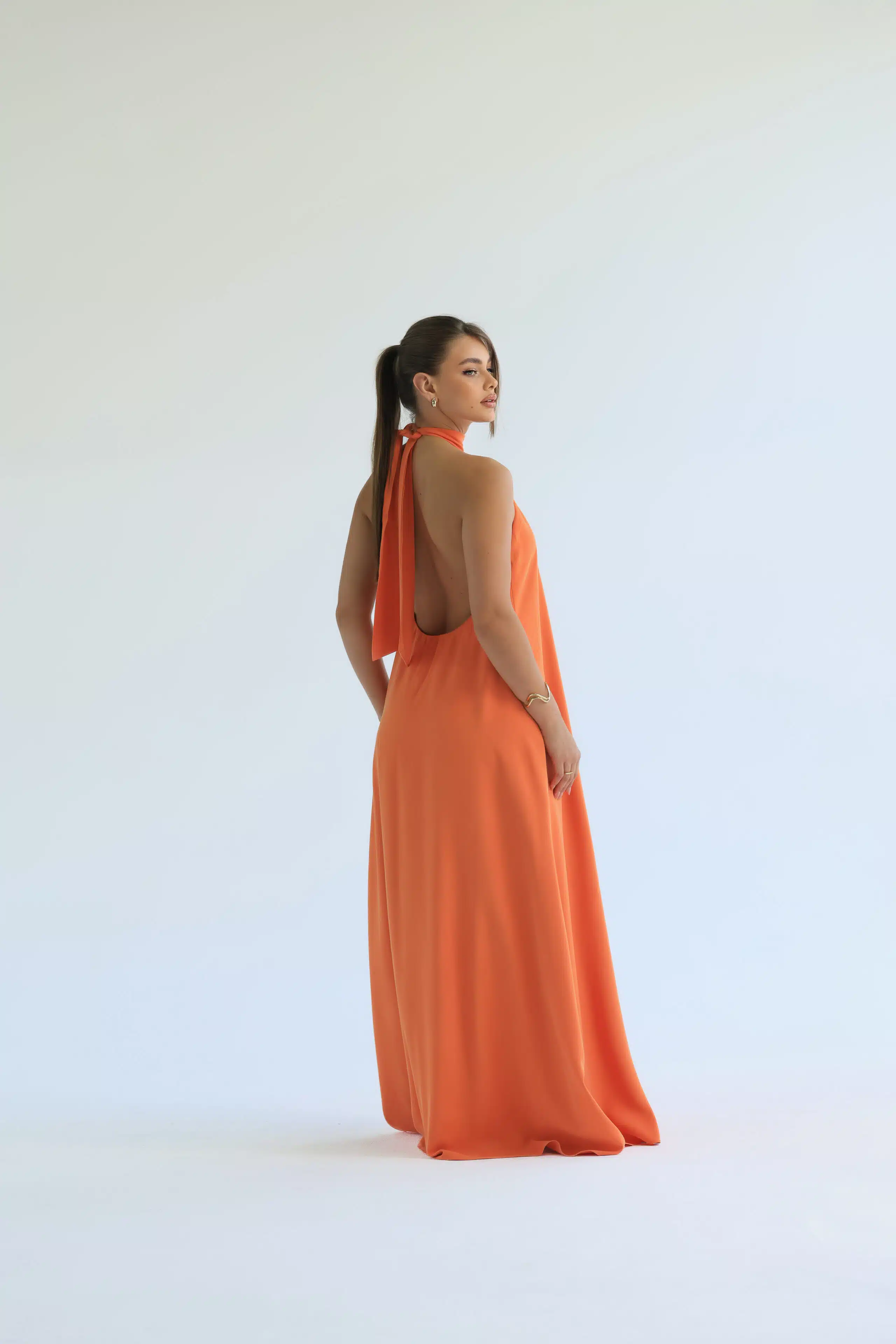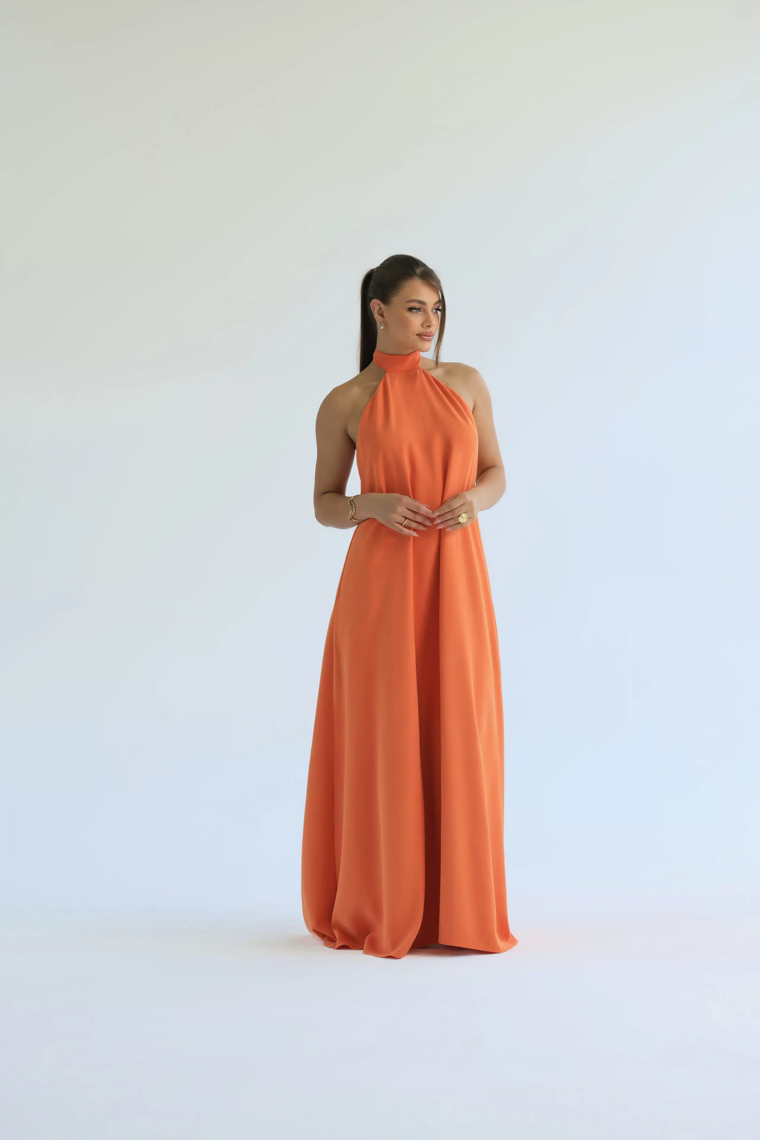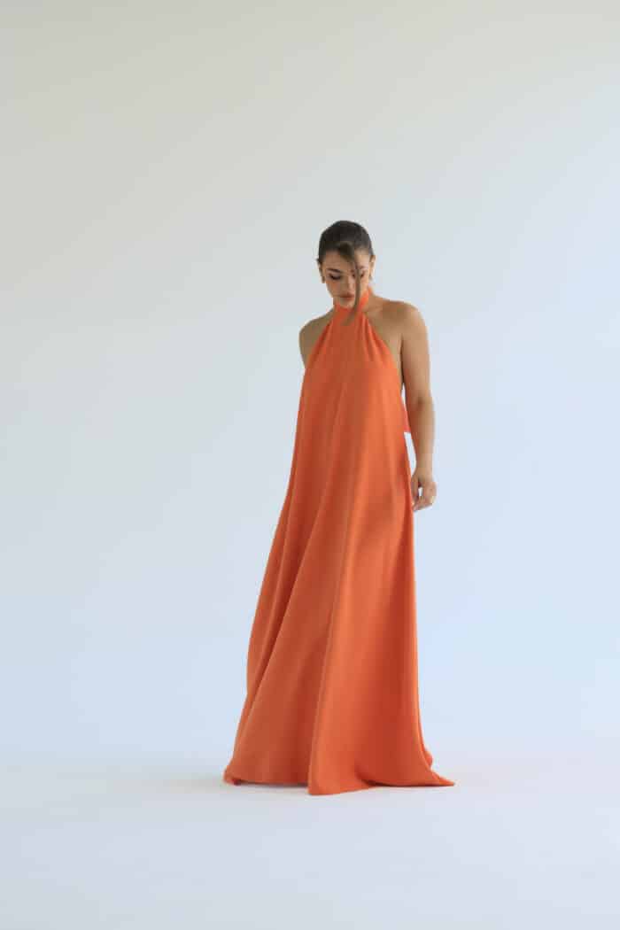 Vestido longo, fluido e frente única. A gola alta e os detalhes das costas abertas criam um efeito moderno e delicado, enquanto a leveza e o toque macio do tecido garantem conforto. Disponível nas cores laranja e off white.