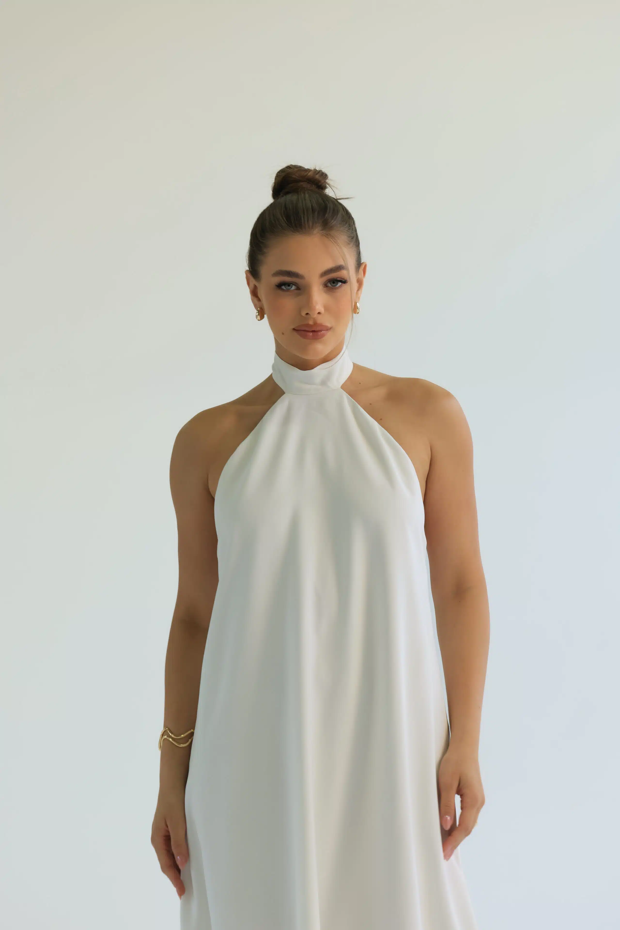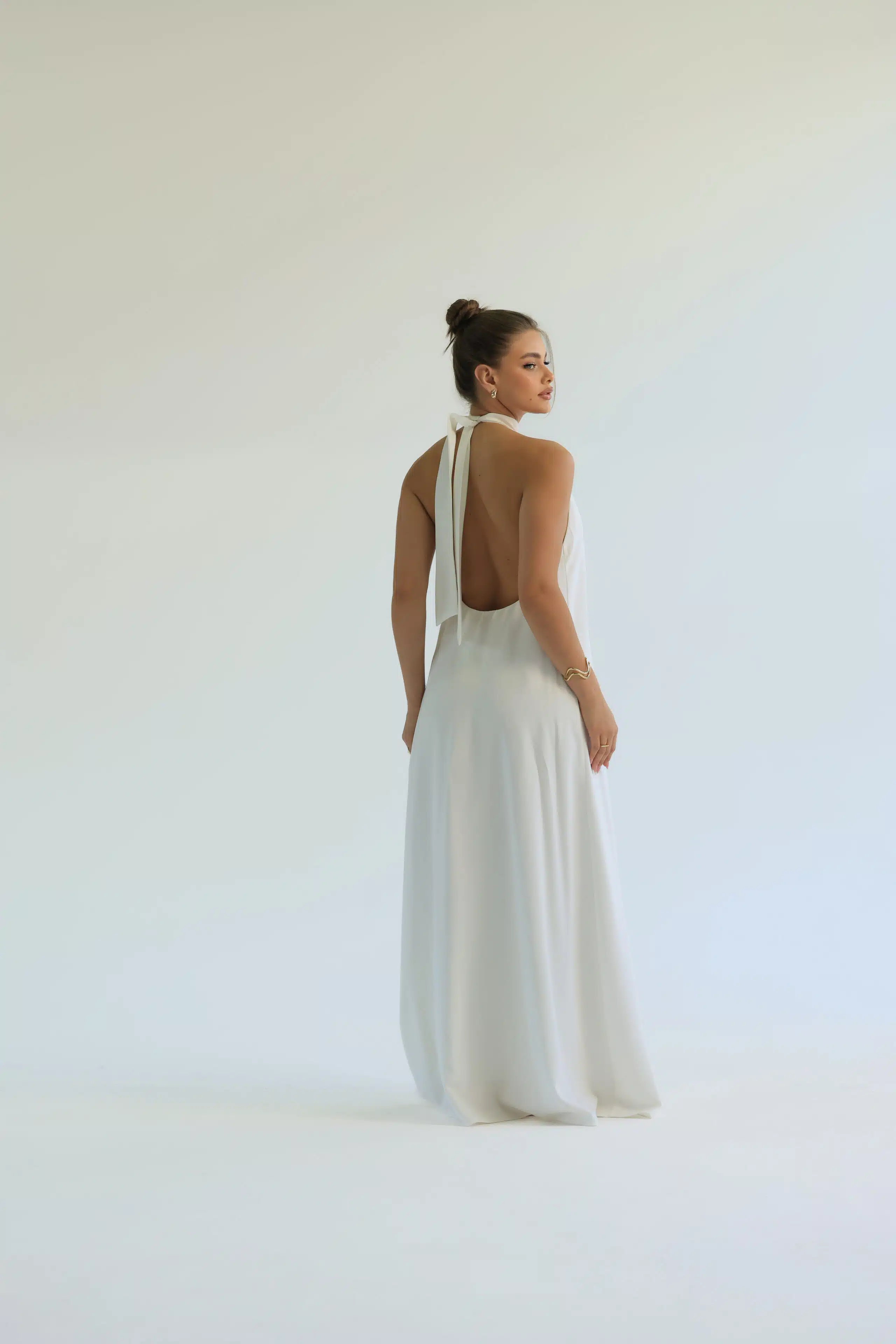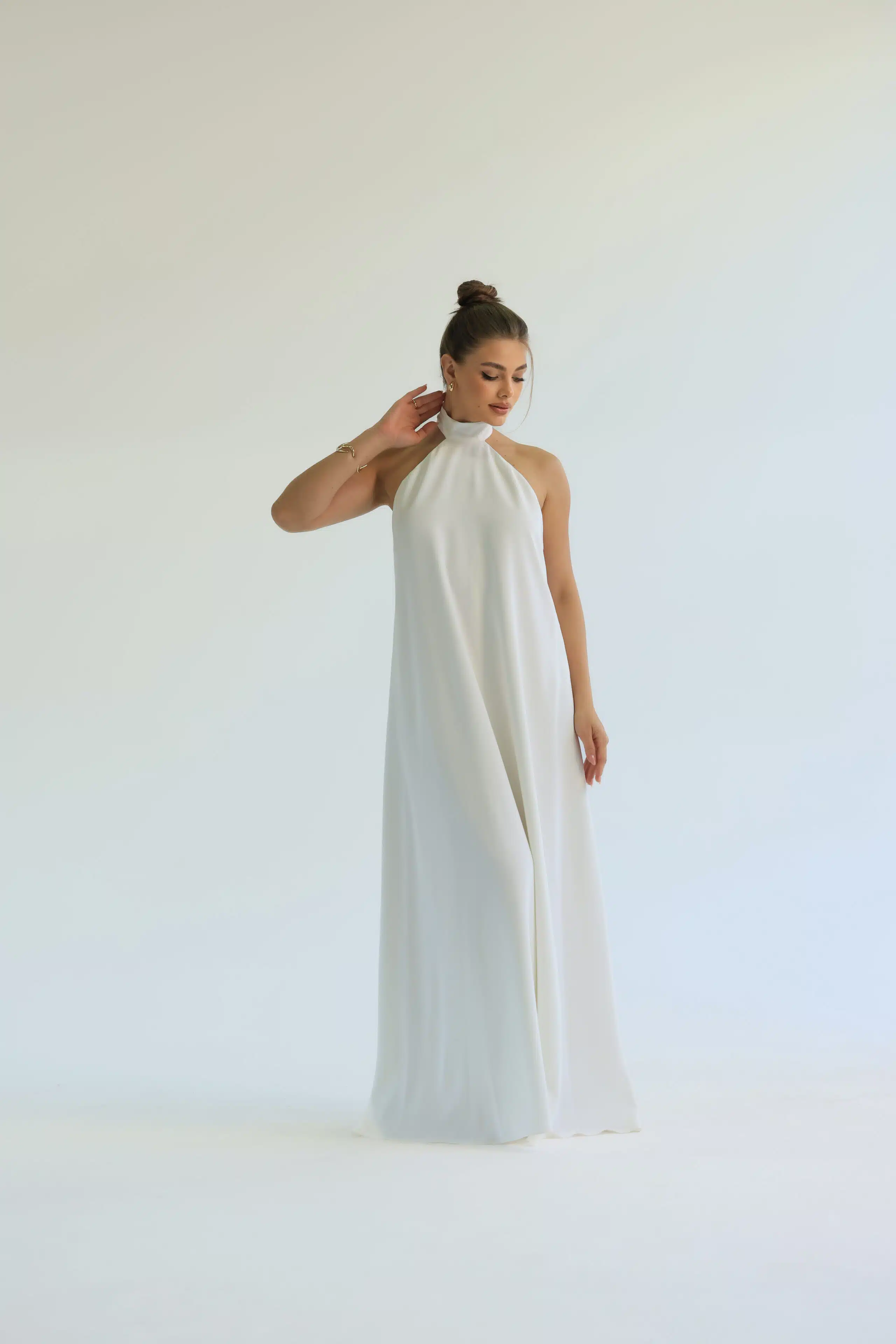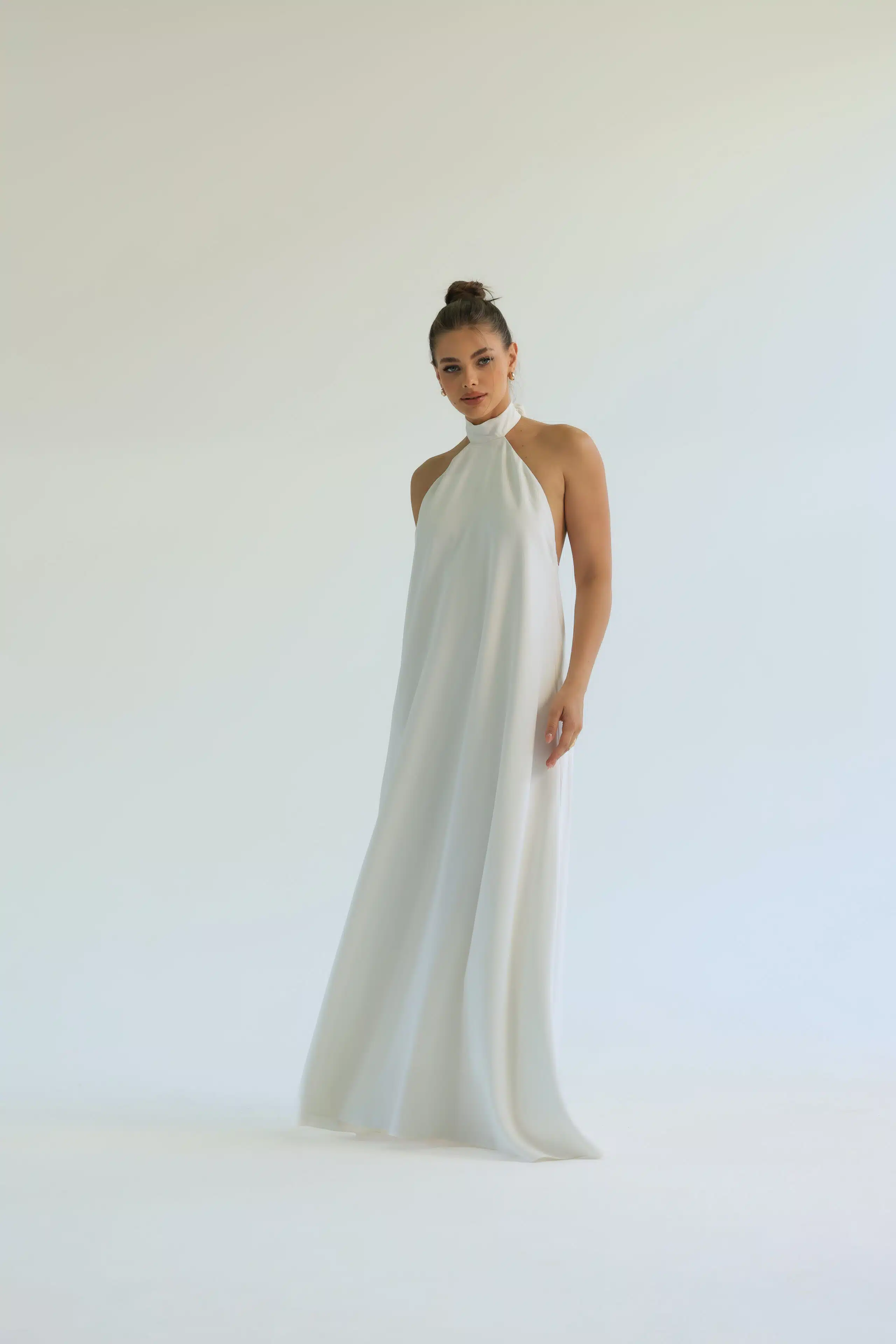 Vestido longo, fluido e frente única. A gola alta e os detalhes das costas abertas criam um efeito moderno e delicado, enquanto a leveza e o toque macio do tecido garantem conforto. Disponível nas cores laranja e off white.